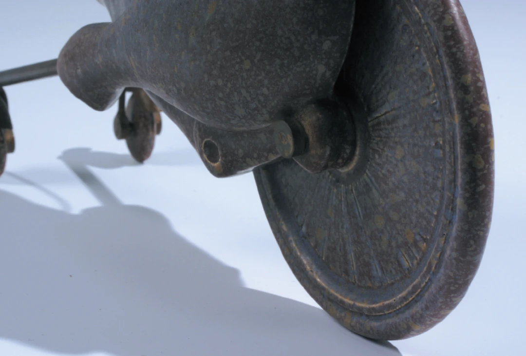 Willem war fasziniert von der Transformation vom Pferd zur Maschine. Er begann mit einigen Skizzen. Das Bild, das ihm in Bezug auf Geschwindigkeit im Gedächtnis blieb, war eine typische Bewegung des Jaguars bei voller Geschwindigkeit oder die eines Windhundes. Dabei verschwinden die Vorderbeine beim Laufen vollständig zwischen den Hinterbeinen. Die nächste Bewegung ist, dass die Tiere ihre Beine wieder vollständig strecken. Eine hyperschnelle Bewegung. So kam er zu diesem Modell. Zwischen diesen Hinterbeinen befindet sich das Hinterrad. Und die Hinterbeine sind nach vorne gestreckt, und dort befinden sich die Vorderräder. Mit Schutzblech und Stoßdämpfer. Das F1-Rennpferd war einst auf der TEFAF ausgestellt. Es wurde nicht verkauft, war aber das meistfotografierte Werk der Kunstmesse! Die Menschen verstanden es nicht. Das ist laut Willem Lenssinck eigentlich das Schönste. Es wird nicht wirklich als zeitgenössisch anerkannt, weil es seiner Zeit weit voraus ist.