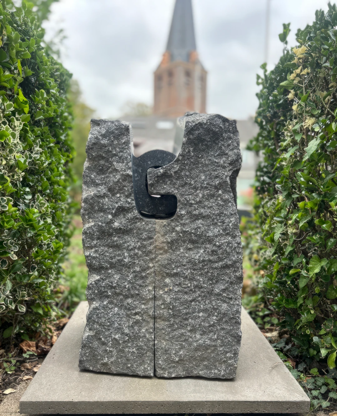 'From the Earth to the World' bestaat uit twee robuuste blokken natuursteen die rechtop tegenover elkaar staan. De buitenkanten zijn ruw en onaangetast. Alsof de steen zo uit de aarde is gelicht. Tussen de twee delen opent zich een smalle doorgang, een opening die uitnodigt om doorheen te kijken en te denken. In die opening heeft Mutal een donker, glad gevormd element gevormd dat contrasteert met de ruwe huid van de steen.